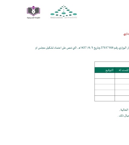 إداري رار الـوزاري رقـم 37617168وتـاريخ 1437 /4 /1ه ,التي تنص على اعتماد تشكيل مجلس او المسند له التوقيع ة الحالية , حيال ذلك .