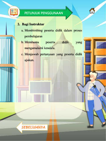 PETUNJUK PENGGUNAAN 2. Bagi Instruktur a. Membimbing peserta didik dalam proses pembelajaran b. Membantu peserta didik yang mengamalami kendala. c. Menjawab pertanyaan yang peserta didik ajukan. SEBELUMNYA