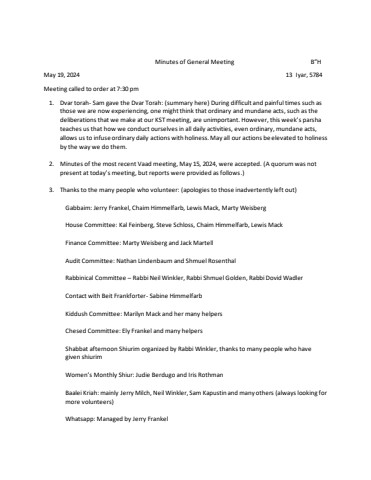 Minutes of General Meeting B”HMay 19, 2024 13 Iyar, 5784Meeting called to order at 7:30 pm1. Dvar torah- Sam gave the Dvar Torah: (summary here) During difficult and painful times such as those we are now experiencing, one might think that ordinary and mundane acts, such as the deliberations that we make at our KST meeting, are unimportant. However, this week’s parsha teaches us that how we conduct ourselves in all daily activities, even ordinary, mundane acts, allows us to infuse ordinary daily actions with holiness. May all our actions be elevated to holiness by the way we do them.2. Minutes of the most recent Vaad meeting, May 15, 2024, were accepted. (A quorum was not present at today’s meeting, but reports were provided as follows.)3. Thanks to the many people who volunteer: (apologies to those inadvertently left out)Gabbaim: Jerry Frankel, Chaim Himmelfarb, Lewis Mack, Marty WeisbergHouse Committee: Kal Feinberg, Steve Schloss, Chaim Himmelfarb, Lewis MackFinance Committee: Marty Weisberg and Jack MartellAudit Committee: Nathan Lindenbaum and Shmuel RosenthalRabbinical Committee – Rabbi Neil Winkler, Rabbi Shmuel Golden, Rabbi Dovid WadlerContact with Beit Frankforter- Sabine HimmelfarbKiddush Committee: Marilyn Mack and her many helpersChesed Committee: Ely Frankel and many helpersShabbat afternoon Shiurim organized by Rabbi Winkler, thanks to many people who have given shiurimWomen’s Monthly Shiur: Judie Berdugo and Iris RothmanBaalei Kriah: mainly Jerry Milch, Neil Winkler, Sam Kapustin and many others (always looking for more volunteers)Whatsapp: Managed by Jerry Frankel