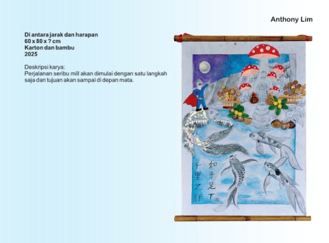 Anthony Lim Di antara jarak dan harapan 60 x 80 x ? cm Karton dan bambu 2025 Deskripsi karya: Perjalanan seribu mill akan dimulai dengan satu langkah saja dan tujuan akan sampai di depan mata.
