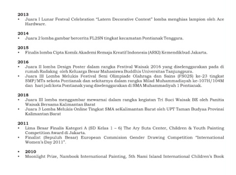 • Finalis lomba Cipta Komik Akademi Remaja Kreatif Indonesia (ARKI) Kemendikbud Jakarta.
