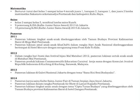 • Berturut-turut dari kelas 1 sampai kelas 4 meraih juara 1, harapan 2, harapan 1, dan juara 2 lomba