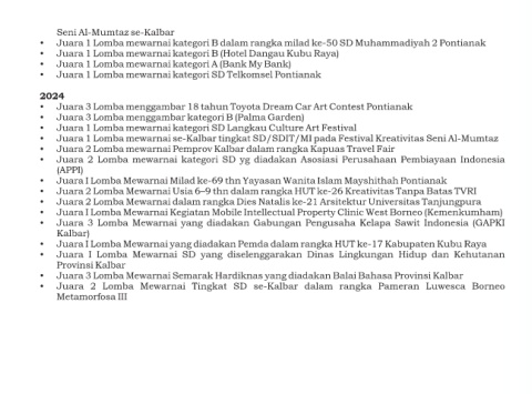 • Juara 3 Lomba Mewarnai Semarak Hardiknas yang diadakan Balai Bahasa Provinsi Kalbar