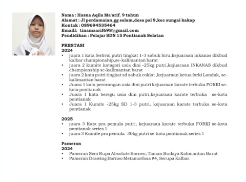 • Juara 1 kata perorangan usia dini putri kejuaraan karate terbuka FORKI se-