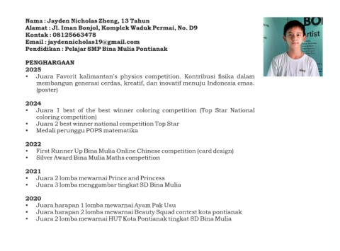 Nama : Jayden Nicholas Zheng, 13 Tahun