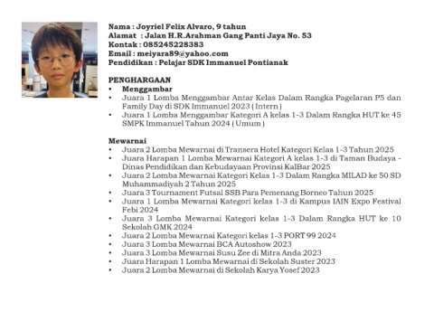Nama : Joyriel Felix Alvaro, 9 tahun