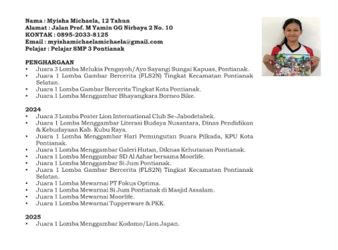 • Juara 3 Lomba Melukis Pengayoh/Ayo Sayangi Sungai Kapuas, Pontianak.