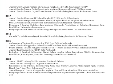 • Juara 1 Lomba Busana Dayak Kreasi Anak di Rumah Radakng Pontianak, Kalimantan Barat