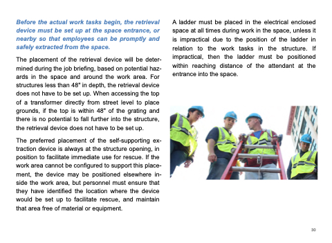 The placement of the retrieval device will be deter- mined during the job briefing, based on potential haz- ards in the space and around the work area. For structures less than 48" in depth, the retrieval device does not have to be set up. When accessing the top of a transformer directly from street level to place grounds, if the top is within 48" of the grating and there is no potential to fall further into the structure, the retrieval device does not have to be set up.
