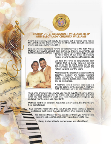 It is an esteemed pleasure for me to welcome you to the 10th Annual Mother’s Day Award Concert. I am extremely grateful to Almighty God for this milestone. In these 10 years, we had the privilege and opportunity to honor some of our pillars and unsung heroes around the Turks and Caicos Islands.
