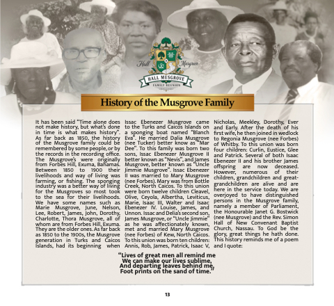As far back as 1850, the history of the Musgrove family could be remembered by some people, or by the records in the recording office. The Musgrove’s were originally from Forbes Hill, Exuma, Bahamas.
