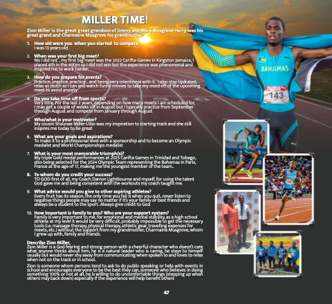 Describe Zion Miller, Describe Zion Miller, Zion Miller is a God fearing and strong person with a cheerful character who doesn’t care Zion Miller is a God fearing and strong person with a cheerful character who doesn’t care what anyone thinks about him, he is a natural leader who is caring, he stays to himself what anyone thinks about him, he is a natural leader who is caring, he stays to himself usually but would never shy away from communicating when spoken to and loves to relax usually but would never shy away from communicating when spoken to and loves to relax when not on the track or in school. when not on the track or in school.