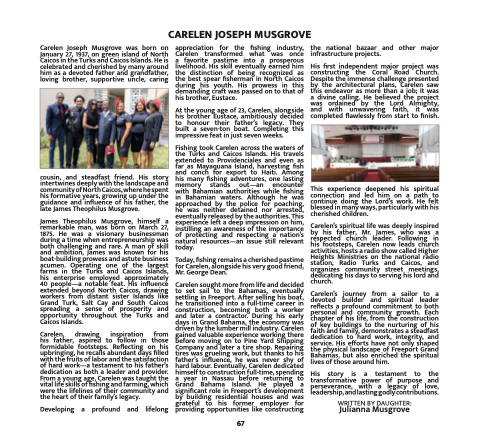 cousin, and steadfast friend. His story cousin, and steadfast friend. His story intertwines deeply with the landscape and intertwines deeply with the landscape and community of North Caicos, where he spent community of North Caicos, where he spent his formative years, growing up under the his formative years, growing up under the guidance and influence of his father, the guidance and influence of his father, the late James Theophilus Musgrove. late James Theophilus Musgrove.