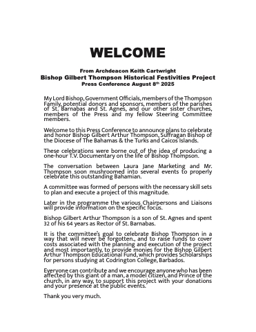 Welcome to this Press Conference to announce plans to celebrate and honor Bishop Gilbert Arthur Thompson, Suffragan Bishop of the Diocese of The Bahamas & the Turks and Caicos Islands.
