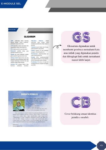 E-MODULE SEL Glosarium digunakan untuk membantu pembaca memahami kata atau istilah yang digunakan penulis dan dilengkapi link untuk memahami materi lebih lanjut. Cover belakang emuat identitas penulis e-module. xix