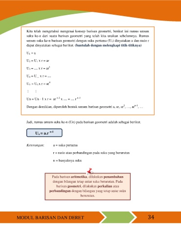 Dengan demikian, diperoleh bentuk umum barisan geometri a, ar, ar , …, ar , …