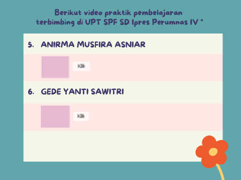 Berikut video praktik pembelajaran terbimbing di UPT SPF SD Ipres Perumnas IV " 5. ANIRMA MUSFIRA ASNIAR 6. GEDE YANTI SAWITRI