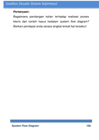 Analisis Desain Sistem Informasi Pertanyaan: Bagaimana pandangan kalian terhadap realisasi proses bisnis dari contoh kasus kedalam system flow diagram? Berikan pendapat anda secara singkat terkait hal tersebut! System Flow Diagram 106