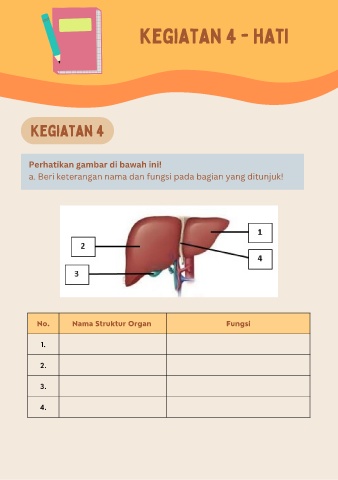 kegiatan 4 - hati Kegiatan 4 Perhatikan gambar di bawah ini! a. Beri keterangan nama dan fungsi pada bagian yang ditunjuk! No. Nama Struktur Organ Fungsi 1. 2. 3. 4.
