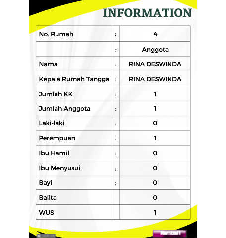 INFORMATION No. Rumah : 4 : Anggota Nama : RINA DESWINDA Kepala Rumah Tangga : RINA DESWINDA Jumlah KK : 1 Jumlah Anggota : 1 Laki-laki : 0 Perempuan : 1 Ibu Hamil : 0 Ibu Menyusui ; 0 Bayi ; 0 Balita 0 WUS 1