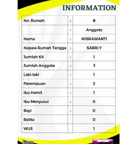 INFORMATION No. Rumah : 6 : Anggota Nama : MISRAWANTI Kepala Rumah Tangga : SABRI.Y Jumlah KK : 1 Jumlah Anggota : 3 Laki-laki : 1 Perempuan : 2 Ibu Hamil : 1 Ibu Menyusui ; 0 Bayi ; 0 Balita 0 WUS 1