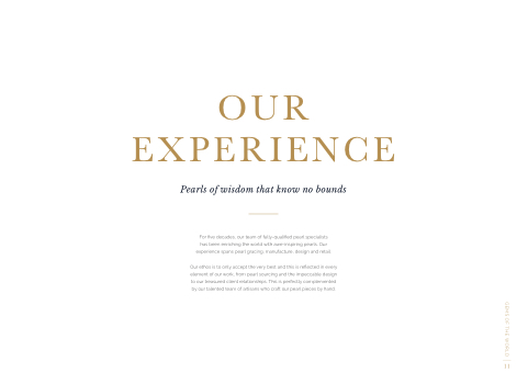 For ve decades our team of fully-quali ed pearl specialists has been enriching the world with awe-inspiring pearls Our experience spans pearl gracing manufacture design and retail Our ethos is is is to only accept the very very best and this is is is re ected in every element of our our work from pearl sourcing and the impeccable design to our treasured client relationships This is is perfectly complemented by by our our talented team of artisans who craft our our pearl pieces by by hand 11