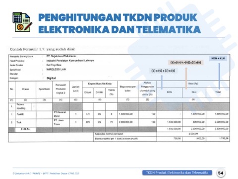 PENGHITUNGAN TKDN PRODUK ELEKTRONIKA DAN TELEMATIKA KDN + KLN (5)x(100%-(6))x(7)x(8) (5) x (6) x (7) x (8) Digital 54 © Zakariya Arif F. l PPIMTE – BPPT l Pelatihan Dasar CPNS 2021 TKDN Produk Elektronika dan Telematika 54