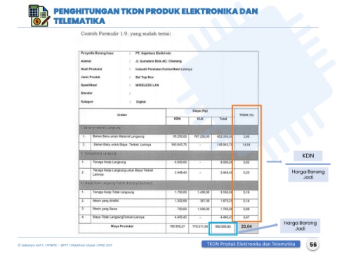 PENGHITUNGAN TKDN PRODUK ELEKTRONIKA DAN TELEMATIKA KDN Harga Barang Jadi Harga Barang Jadi 56 © Zakariya Arif F. l PPIMTE – BPPT l Pelatihan Dasar CPNS 2021 TKDN Produk Elektronika dan Telematika 56