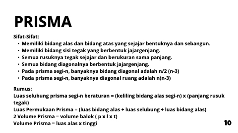 • Pada prisma segi-n, banyaknya bidang diagonal adalah n/2 (n-3)