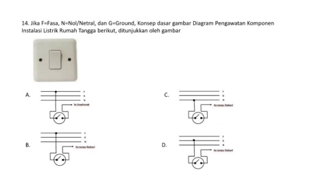14. Jika F=Fasa, N=Nol/Netral, dan G=Ground, Konsep dasar gambar Diagram Pengawatan Komponen Instalasi Listrik Rumah Tangga berikut, ditunjukkan oleh gambar A. C. B. D.