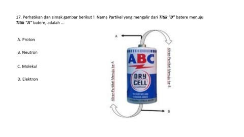 17. Perhatikan dan simak gambar berikut ! Nama Partikel yang mengalir dari Titik "B" batere menuju Titik "A" batere, adalah ... A. Proton B. Neutron C. Molekul D. Elektron
