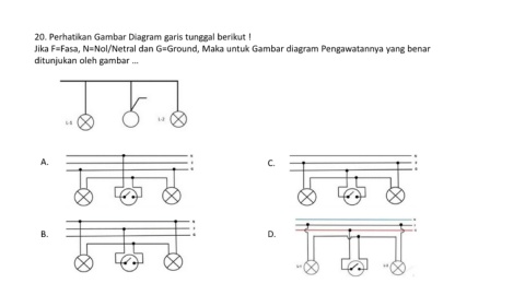 20. Perhatikan Gambar Diagram garis tunggal berikut ! Jika F=Fasa, N=Nol/Netral dan G=Ground, Maka untuk Gambar diagram Pengawatannya yang benar ditunjukan oleh gambar … A. C. B. D.