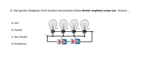 21. Dari gambar Rangkaian listrik tersebut menunjukkan bahwa Bentuk rangkaian Lampu nya berjenis … A. Seri B. Paralel C. Seri-Paralel D. Kombinasi