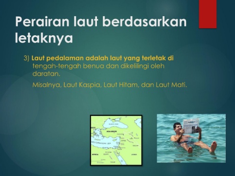 Perairan laut berdasarkan letaknya 3) Laut pedalaman adalah laut yang terletak di tengah-tengah benua dan dikelilingi oleh daratan. Misalnya, Laut Kaspia, Laut Hitam, dan Laut Mati.