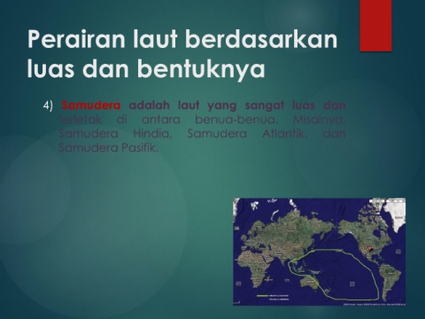 Perairan laut berdasarkan luas dan bentuknya 4) Samudera adalah laut yang sangat luas dan terletak di antara benua-benua. Misalnya, Samudera Hindia, Samudera Atlantik, dan Samudera Pasifik.