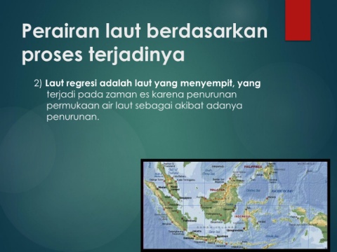 Perairan laut berdasarkan proses terjadinya 2) Laut regresi adalah laut yang menyempit, yang terjadi pada zaman es karena penurunan permukaan air laut sebagai akibat adanya penurunan.