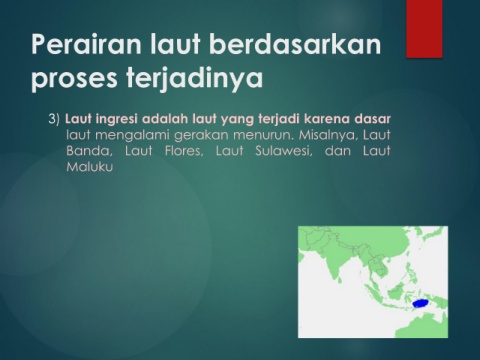 Perairan laut berdasarkan proses terjadinya 3) Laut ingresi adalah laut yang terjadi karena dasar laut mengalami gerakan menurun. Misalnya, Laut Banda, Laut Flores, Laut Sulawesi, dan Laut Maluku