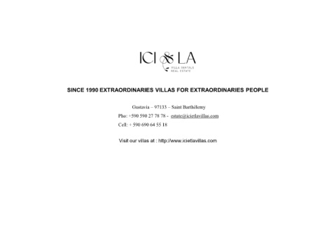 SINCE 1990 EXTRAORDINARIES VILLAS FOR EXTRAORDINARIES PEOPLE Gustavia – 97133 – Saint Barthélemy Pho: +590 590 27 78 78 - estate@icietlavillas.com Cell: + 590 690 64 55 18 Visit our villas at : http://www.icietlavillas.com