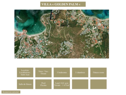 VILLA « GOLDEN PALM « Location: Localisation : View / Vue : 5 bedrooms 5 chambres Fitness room Ocean Saint Jean Pool Land: 0.41 acre Salle de fitness Piscine Terrain : 1 671m² Document non contractuel