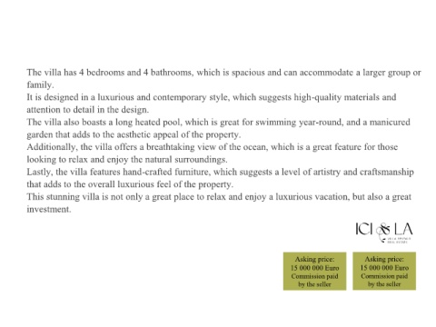 Lastly, the villa features hand-crafted furniture, which suggests a level of artistry and craftsmanship