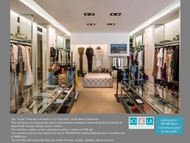 This location is exceptional, the shop is surrounded by boutiques representing the best brands in 700 000 Euro