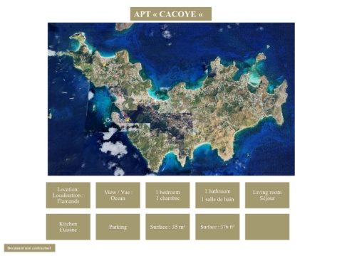 APT « CACOYE « Location: 1 bathroom Localisation : View / Vue : 1 bedroom Living room Séjour Ocean 1 chambre Flamands 1 salle de bain Kitchen Parking Surface : 35 m² Surface : 376 ft² Cuisine Document non contractuel