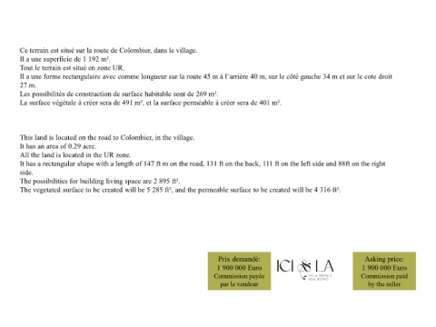 It has a rectangular shape with a length of 147 ft m on the road, 131 ft on the back, 111 ft on the left side and 88ft on the right