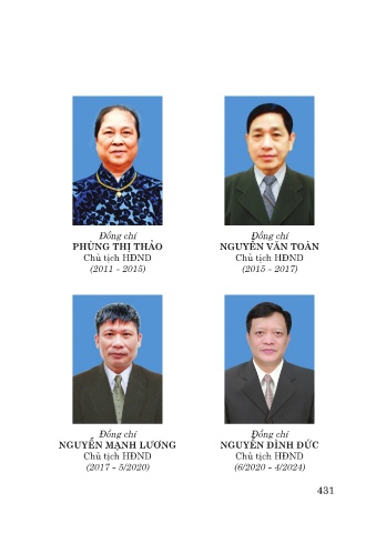 Đồng chí Đồng chí PHÙNG THỊ THẢO NGUYỄN VĂN TOÀN Chủ tịch HĐND Chủ tịch HĐND (2011 - 2015) (2015 - 2017) Đồng chí Đồng chí NGUYỄN MẠNH LƯƠNG NGUYỄN ĐÌNH ĐỨC Chủ tịch HĐND Chủ tịch HĐND (2017 - 5/2020) (6/2020 - 4/2024) 431