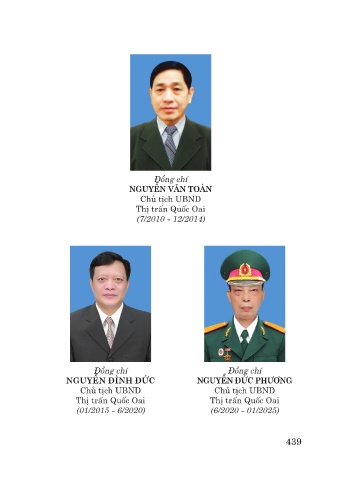 Đồng chí NGUYỄN VĂN TOÀN Chủ tịch UBND Thị trấn Quốc Oai (7/2010 - 12/2014) Đồng chí Đồng chí NGUYỄN ĐÌNH ĐỨC NGUYỄN ĐỨC PHƯƠNG Chủ tịch UBND Chủ tịch UBND Thị trấn Quốc Oai Thị trấn Quốc Oai (01/2015 - 6/2020) (6/2020 - 01/2025) 439