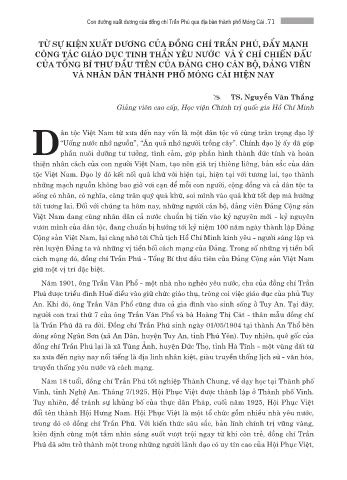 TỪ SỰ KIỆN XUẤT DƯƠNG CỦA ĐỒNG CHÍ TRẦN PHÚ, ĐẨY MẠNH