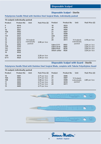 Disposable Scalpel Disposable Scalpel - Sterile Polystyrene handle fitted with Stainless Steel Surgical Blade, individually packed 10 scalpels individually packed Product Product No 6 0516 9 0517 10 0501 10A 0502 11 0503 11P 0591 12 0504 13 0539 14 0519 15 0505 15A 0520 15C 0521 15T 0592 16 0522 12D 0518 E/11 0525 Unit 10 Scalpels individually packed Pack Price (£) 2.00 per box 2.29 per box 2.29 per box Product 18 19 20 21 22 22A 23 24 Sabre E/11 Sabre D/15 Sabre B/23 Stitch cutter Product No 0523 0524 0506 0507 0508 0509 0510 0511 0563 0565 0570 0526 Unit 10 Scalpels individually packed Pack Price (£) 2.10 per box 2.29 per box 2.29 per box 2.29 per box 2.29 per box Disposable Scalpel with Guard - Sterile Polystyrene Handle fitted with Stainless Steel Surgical Blade, complete with Tubular Polyethylene Guard 10 scalpels individually packed Product Product No 10 6601 10A 6602 10R 6690 11 6603 12 6604 15 6605 Unit Pack Price (£) 2.71 per box 2.71 per box 3.60 per box 2.71 per box 2.71 per box 2.71 per box Product 20 21 22 23 24 Product No 6606 6607 6608 6610 6611 Unit 10 Scalpels individually packed Pack Price (£) 2.85 per box 6 Sheffield - England