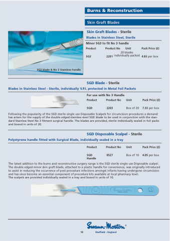 Burns & Reconstruction Skin Graft Blades Skin Graft Blades - Sterile Blades in Stainless Steel, Sterile Minor SG3 to fit No 3 handle SG3 blade & No 3 Stainless handle SGD Blade - Sterile Blades in Stainless Steel - Sterile, individually V.P.I. protected in Metal Foil Packets Following the popularity of the SGD sterile single use Disposable Scalpels for circumcision procedures a demand has arisen for the supply of the double edged stainless steel SGD blade to be used in conjunction with the stan- dard Stainless Steel No 3 fitment surgical handle. The blades are provided, sterile individually sealed in foil packs and boxed in units of 20. Product SG3 Product No Unit Pack Price (£) 20 blades 2201 individually packed 4.83 per box For use with No 3 Handle Product Product No SGD 2203 Unit Box of 20 Pack Price (£) 7.33 per box SGD Disposable Scalpel - Sterile Polystyrene handle fitted with Surgical Blade, individually sealed in a tray Product Product No SGD 0527 Handle Unit Box of 10 Pack Price (£) 4.05 per box The latest addition to the burns and reconstructive surgery range is the SGD sterile single use Disposable scalpel. The double edged minor skin graft blade, attached to a plastic handle for convenience, was originally introduced to assist in reducing the occurrence of post procedure infections amongst infants having undergone circumcision and has since become an essential component of procedure kits available at local pharmacy level. The scalpels are provided individually sealed in a tray and boxed in units of 10. 10 Sheffield - England