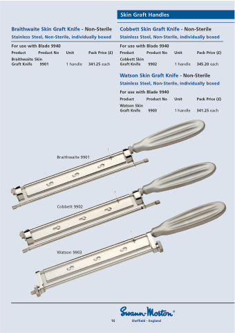 Skin Graft Handles Braithwaite Skin Graft Knife - Non-Sterile Stainless Steel, Non-Sterile, individually boxed Cobbett Skin Graft Knife - Non-Sterile Stainless Steel, Non-Sterile, individually boxed For use with Blade 9940 Product Product No Braithwaite Skin Graft Knife 9901 Unit 1 handle Pack Price (£) 341.25 each For use with Blade 9940 Product Stainless Steel, Non-Sterile, individually boxed Pack Price (£) 345.20 each Watson Skin Graft Knife - Non-Sterile Cobbett Skin Graft Knife Product No 9902 1 handle Unit For use with Blade 9940 Product Watson Skin Graft Knife Product No 9903 Unit 1 handle Pack Price (£) 341.25 each Braithwaite 9901 Cobbett 9902 Watson 9903 16 Sheffield - England