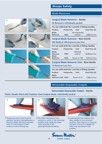 Sharps Safety Blade Removers Surgical Blade Remover - Sterile 50 Removers individually packed For use with both No 3 and No 4 fitting handles 1 2 Product Blade Remover Product No Unit 50 individually 5502 packed Pack Price (£) 6.68 per box 3 4 1 2 6.51 per box Surgical Blade Remover Unit - Non-Sterile Surgical Blade Remover - Non-Sterile 500 (Bulk) & 100 Removers per box For use with both No 3 and No 4 fitting handles Product Product No Blade Remover 5503 Blade Remover 5505 Unit 500 Bulk packed Pack Price (£) 32.24 per box Boxes of 100 10 Removers per box For use with both No 3 and No 4 fitting handles 3 Product Blade Remover Unit Product No 5525 Unit Boxes of 10 Pack Price (£) 5.36 per box Retractable Disposable Scalpels Retractable Disposable Scalpel - Sterile Plastic Handle fitted with Stainless Steel Surgical Blade, individually packed 1 2 3 1 Temporary lock in the forward position has been strengthened so that the blade will stay extended even if it encounters a hard surface or bone during use. 2 The slider mechanism now contains a notch in the retracted position that holds the blade more securely in the passing/retracted position. 3 A permanent lock position has been added to the retracted position. This requires a conscious amount of force to engage the slider into permanent lock position. 14 Sheffield - England
